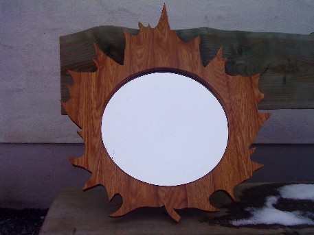 Ein Zimmerspiegel in einem Rahmen von einer Form eines Ahornblattes eingefasst.
